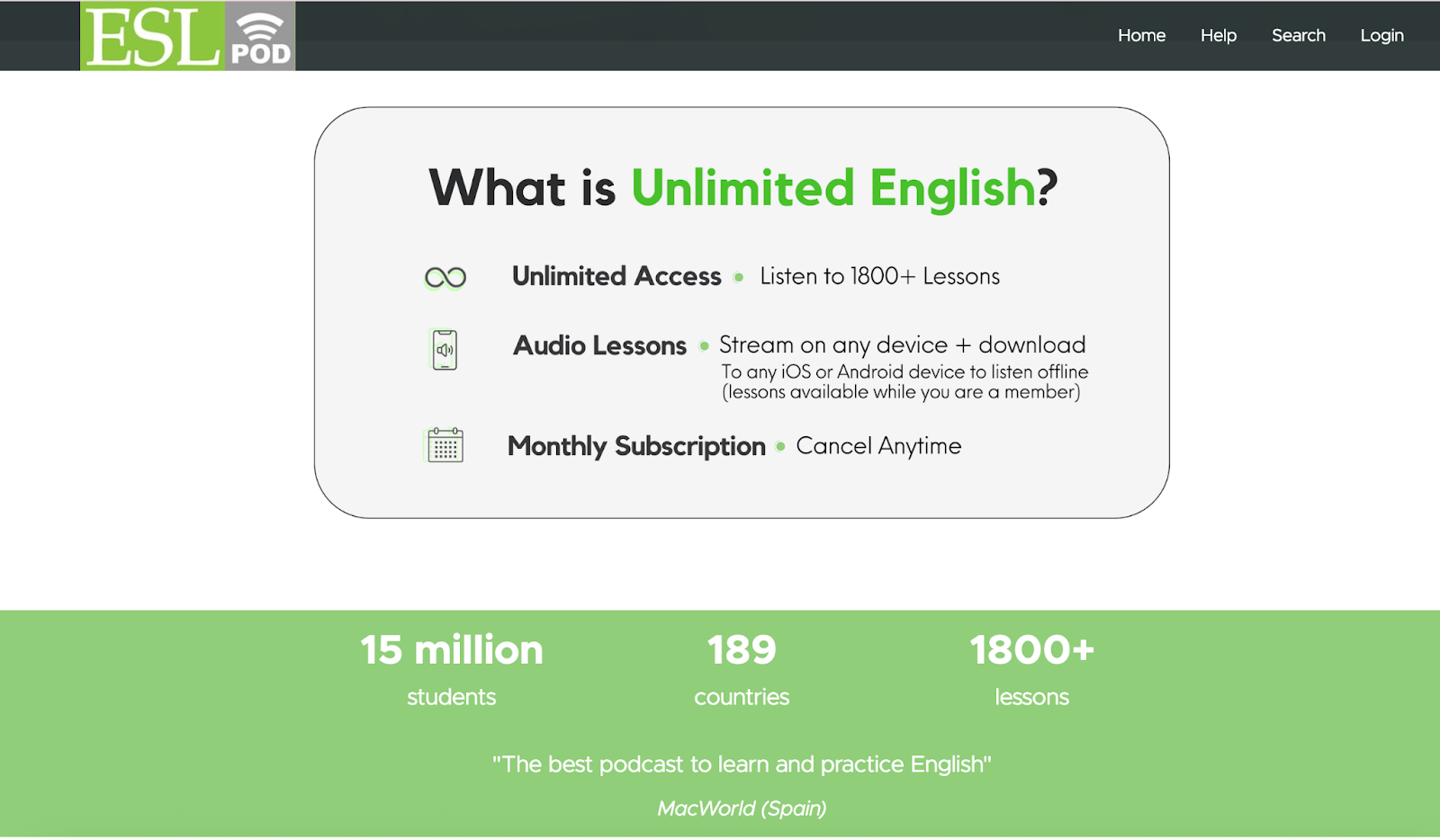 ESLPod là một ứng dụng luyện nghe khá nổi tiếng với nội dung được thiết kế theo kịch bản hội thoại trong đời sống thực. Các bài nghe trên ESLPod thường kéo dài 10-15 phút và đi kèm lời thoại tường thuật. Đây là tài nguyên tuyệt vời dành cho người học thích luyện nghe qua đoạn hội thoại thực tế hơn là các đoạn audio mang tính học thuật hay bài giảng.